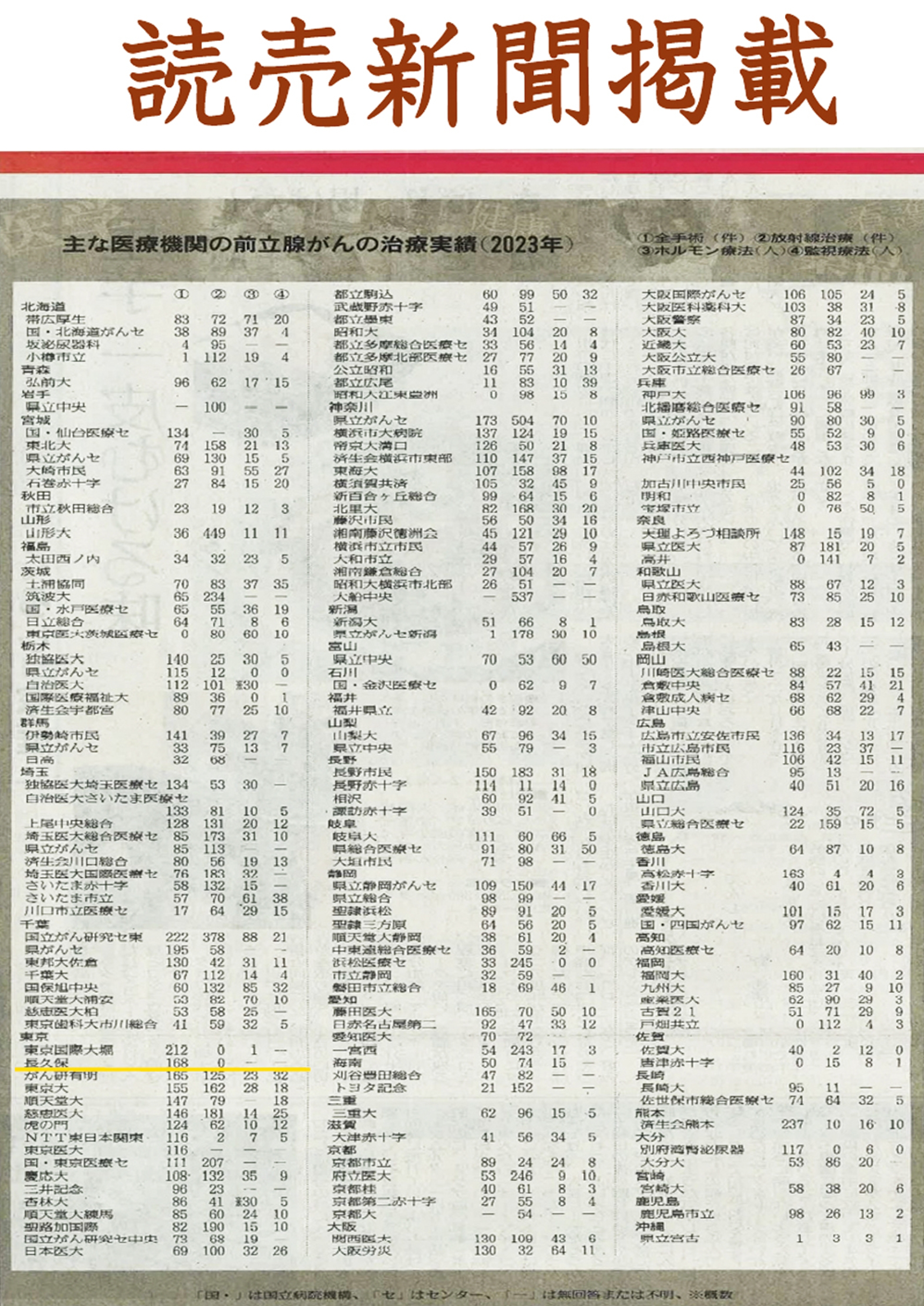 11/20の読売新聞に当院が掲載されました。「前立腺癌の治療実績(2023年)」東京で2位